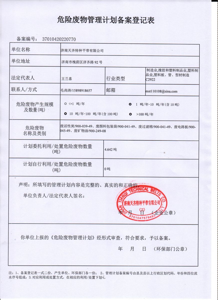 2011年1月公司投資建設(shè)了新型高強復(fù)合材料節(jié)電傳動帶產(chǎn)業(yè)化項目,項目于2011年1月18日取得了濟南市環(huán)境保護局對該項目的環(huán)評審批意見(濟環(huán)報告表[2011]6號),2016年11月15日通過了濟南市槐蔭區(qū)環(huán)境保護局對該項目的竣工環(huán)境保護驗收(濟槐環(huán)建驗[2016]第081號)。該項目于2020年4月首次進行了排污許可證登記?,F(xiàn)該項目正常運行。