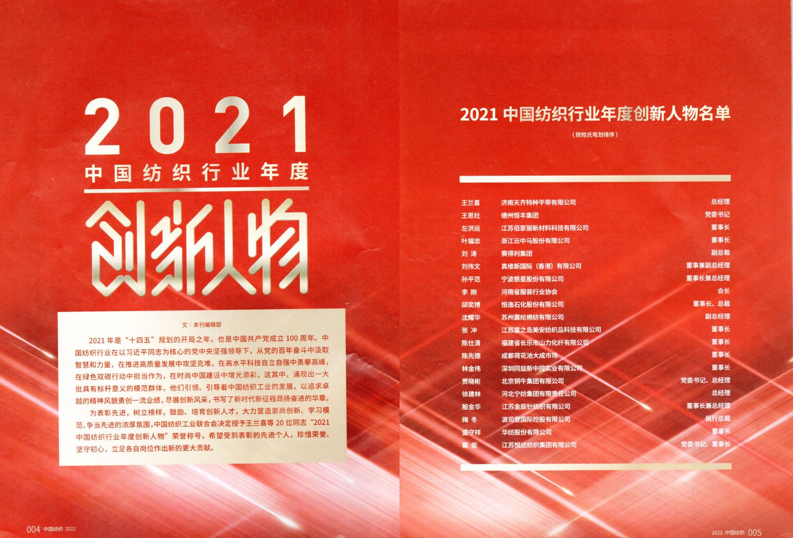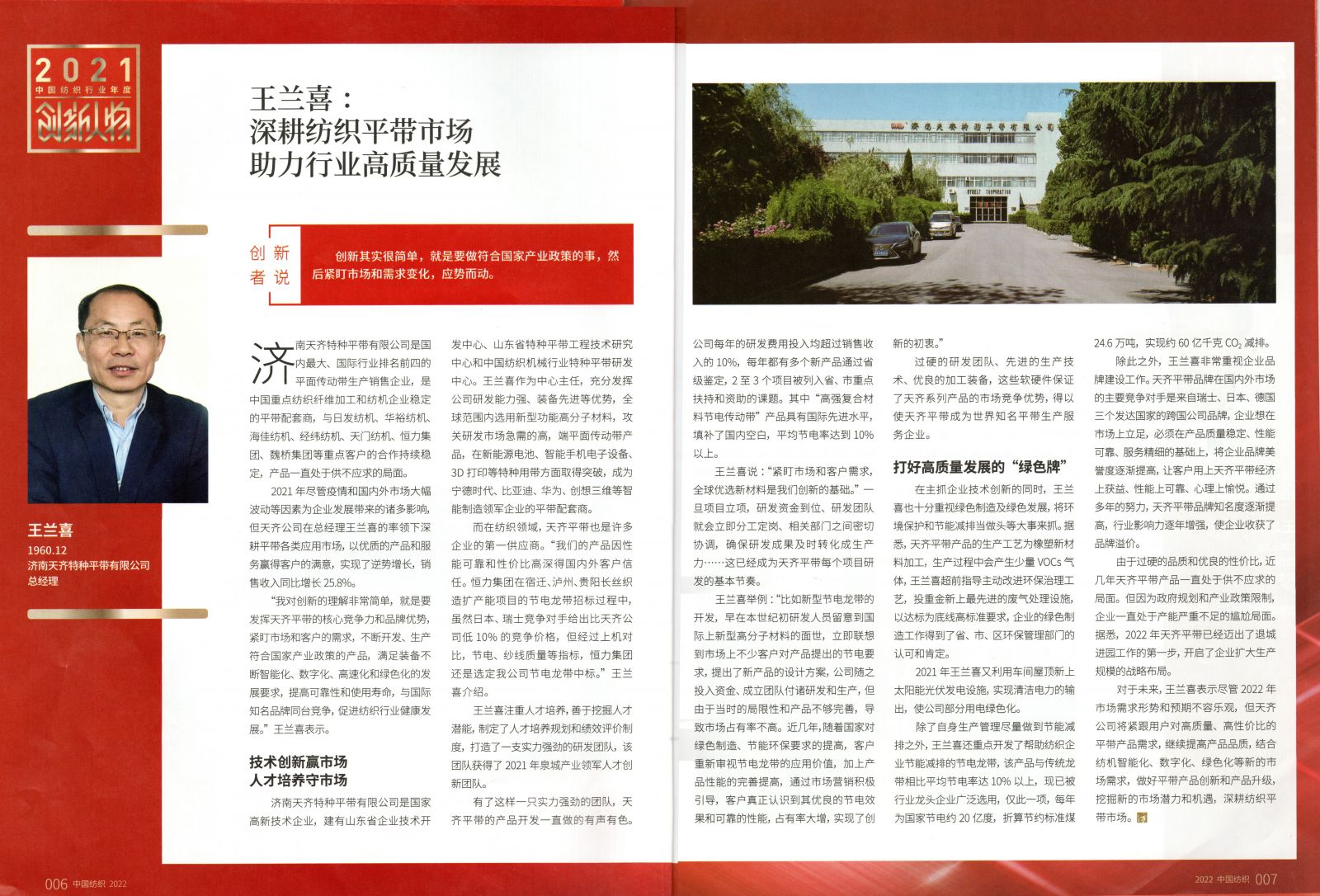 2022年6月27日下午,中國紡織工業(yè)聯(lián)合會(huì)第5次會(huì)員大會(huì)暨五屆一次理事會(huì)五屆一次常務(wù)理事會(huì)以視頻方式召開。會(huì)議下發(fā)了《關(guān)于授予2021中國紡織行業(yè)年度創(chuàng)新人物榮譽(yù)稱號的決定》,授予濟(jì)南天齊特種平帶有限公司總經(jīng)理王蘭喜等20位同志“2021中國紡織行業(yè)年度創(chuàng)新人物”榮譽(yù)稱號。